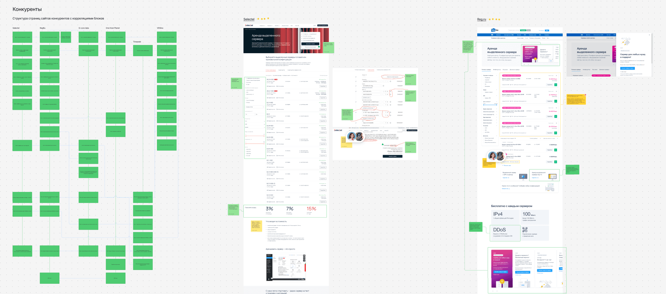 Были проанализированы такие конкуренты как Selectel, Reg Ru, Timeweb, G-Core-Labs, One Host Planet, VDSina. Особое внимание уделялось структуре их продуктовых страниц, устройству конфигуратора сервера и корзины