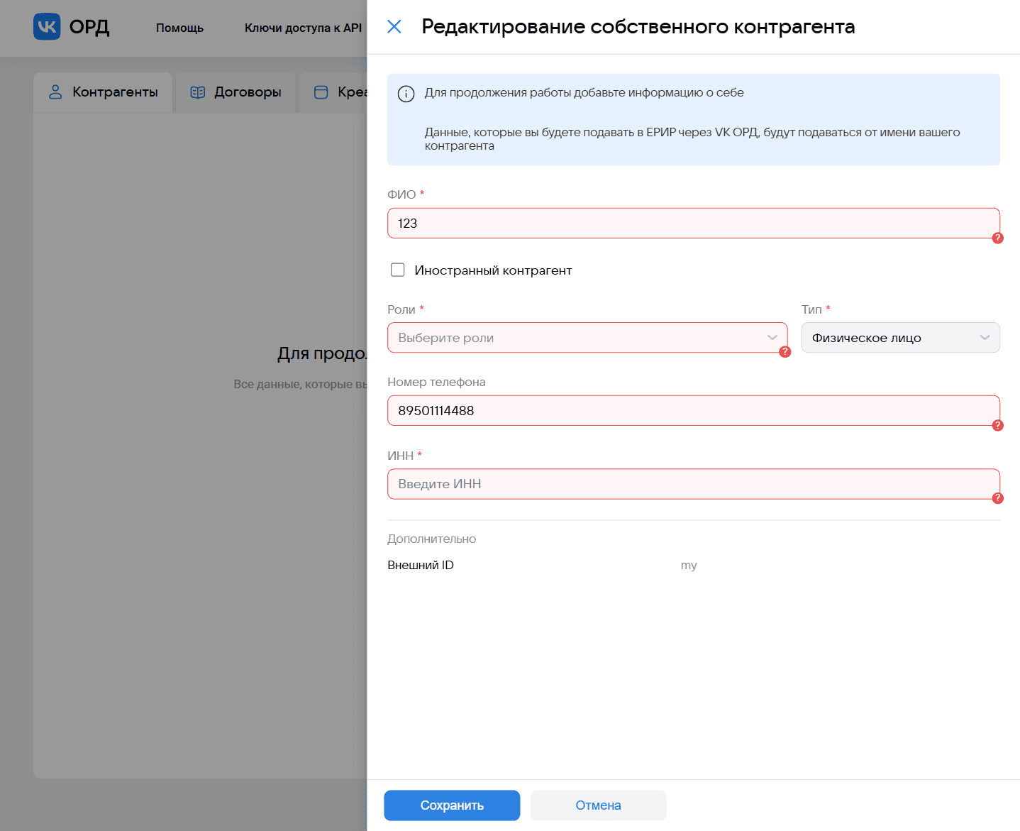 Если ты уже начал заполнять договор и вдруг вспомнил, что забыл завести контрагента, то придётся закрыть форму, уйти в другой таб, а потом заполнять всё заново