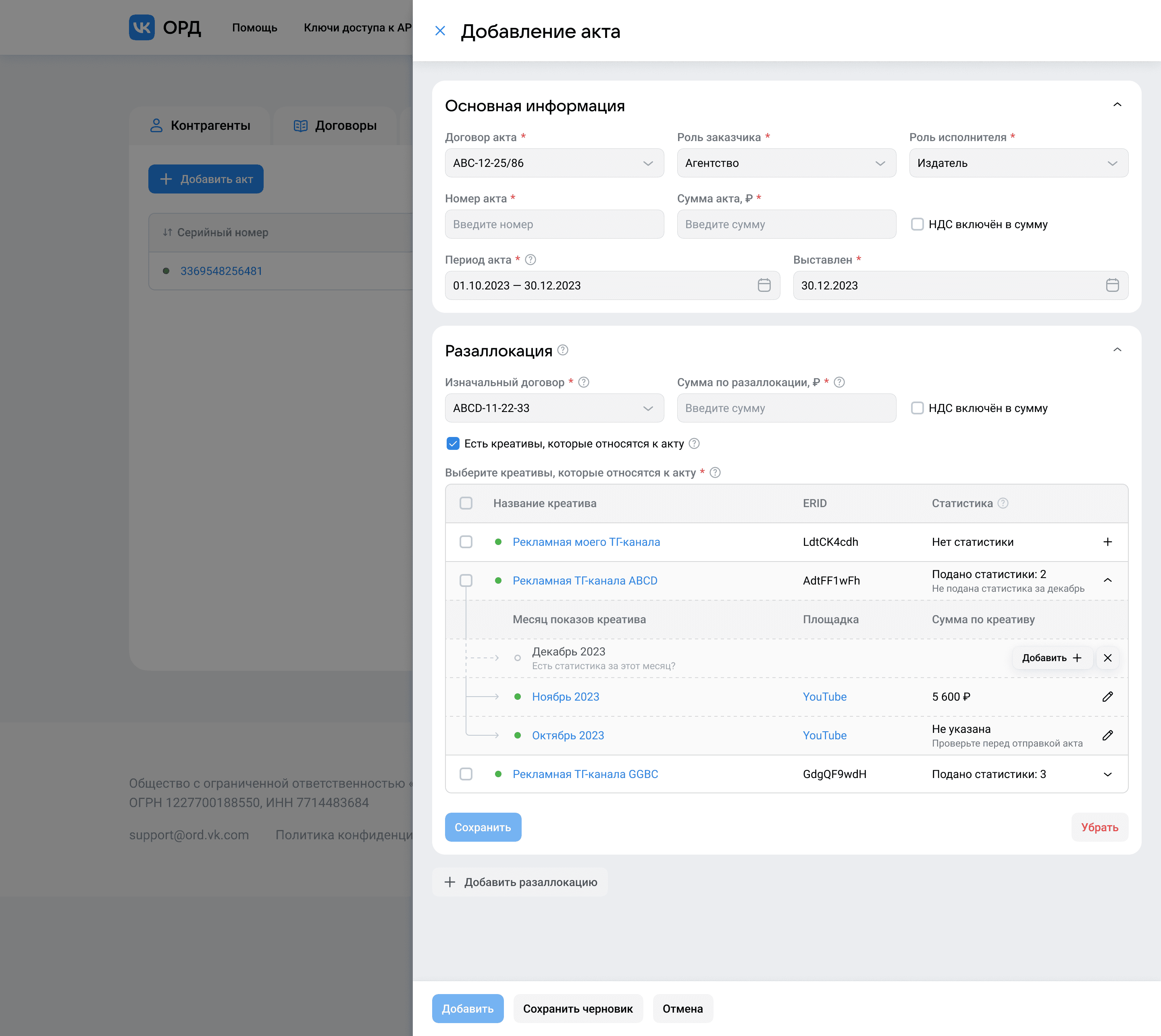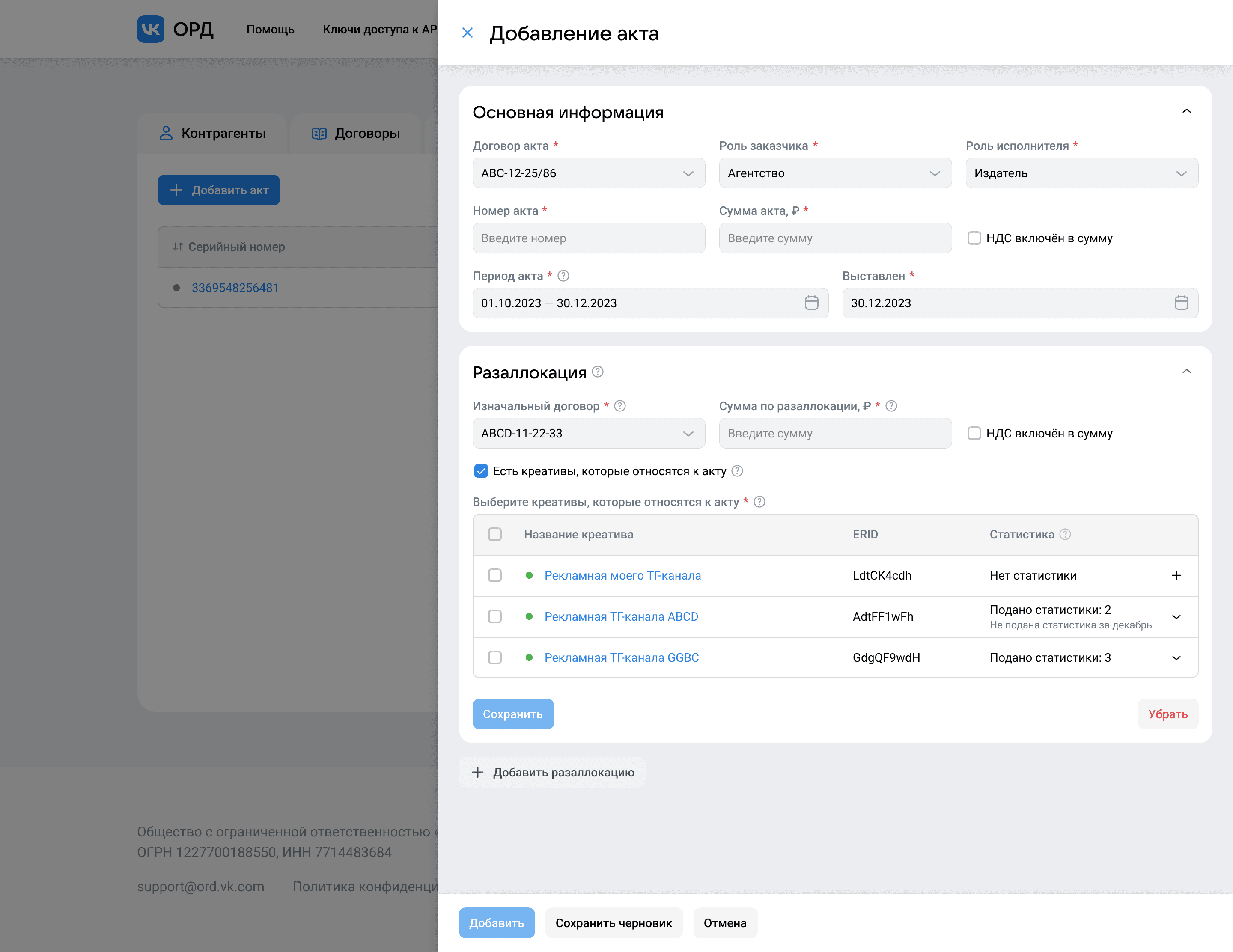 На договор может быть оформлено множество креативов, но благодаря пошаговому заполнению нужных полей, форма умеет анализировать данные и выводить только релевантные для конкретного периода и договора креативы, не отображая лишнего