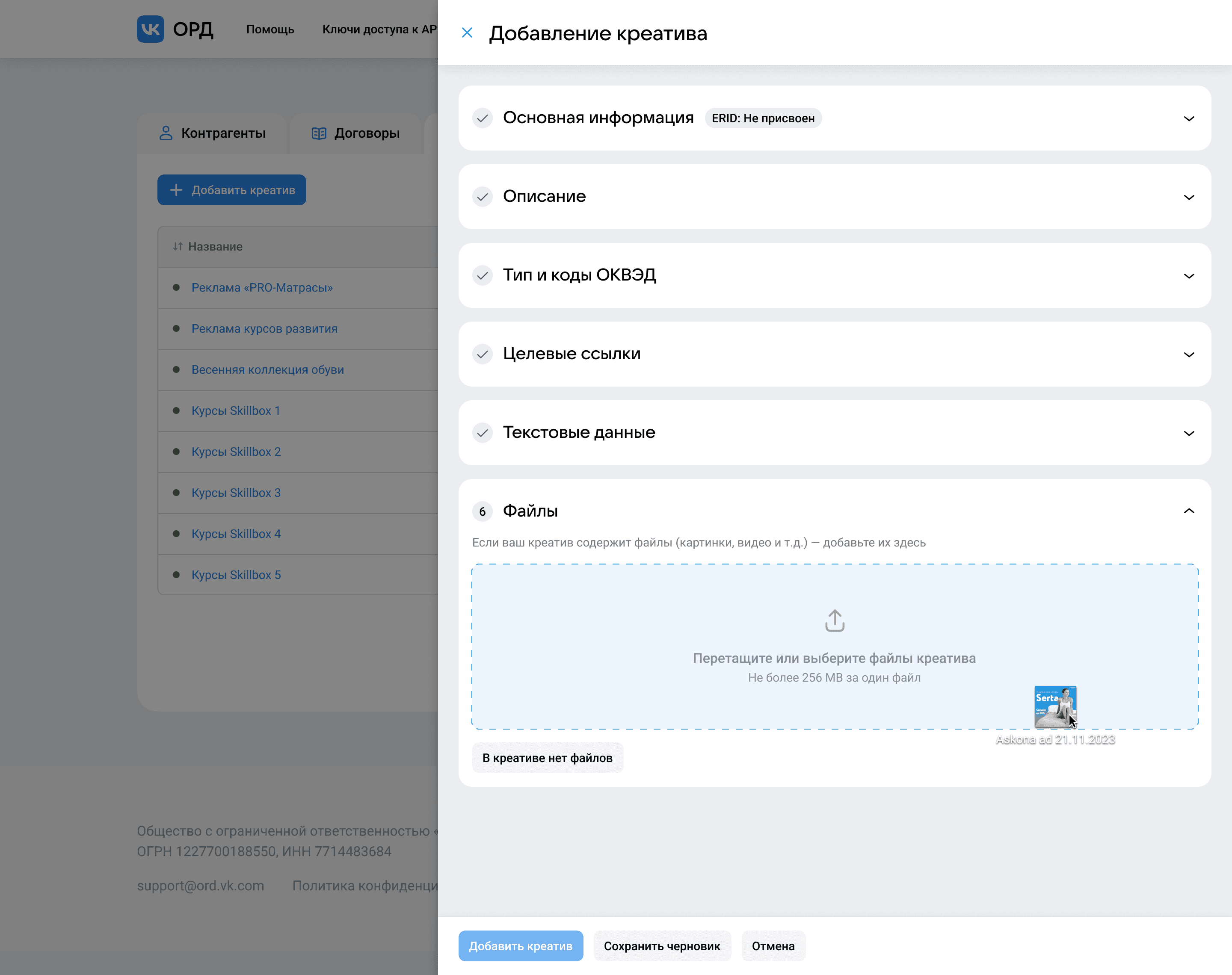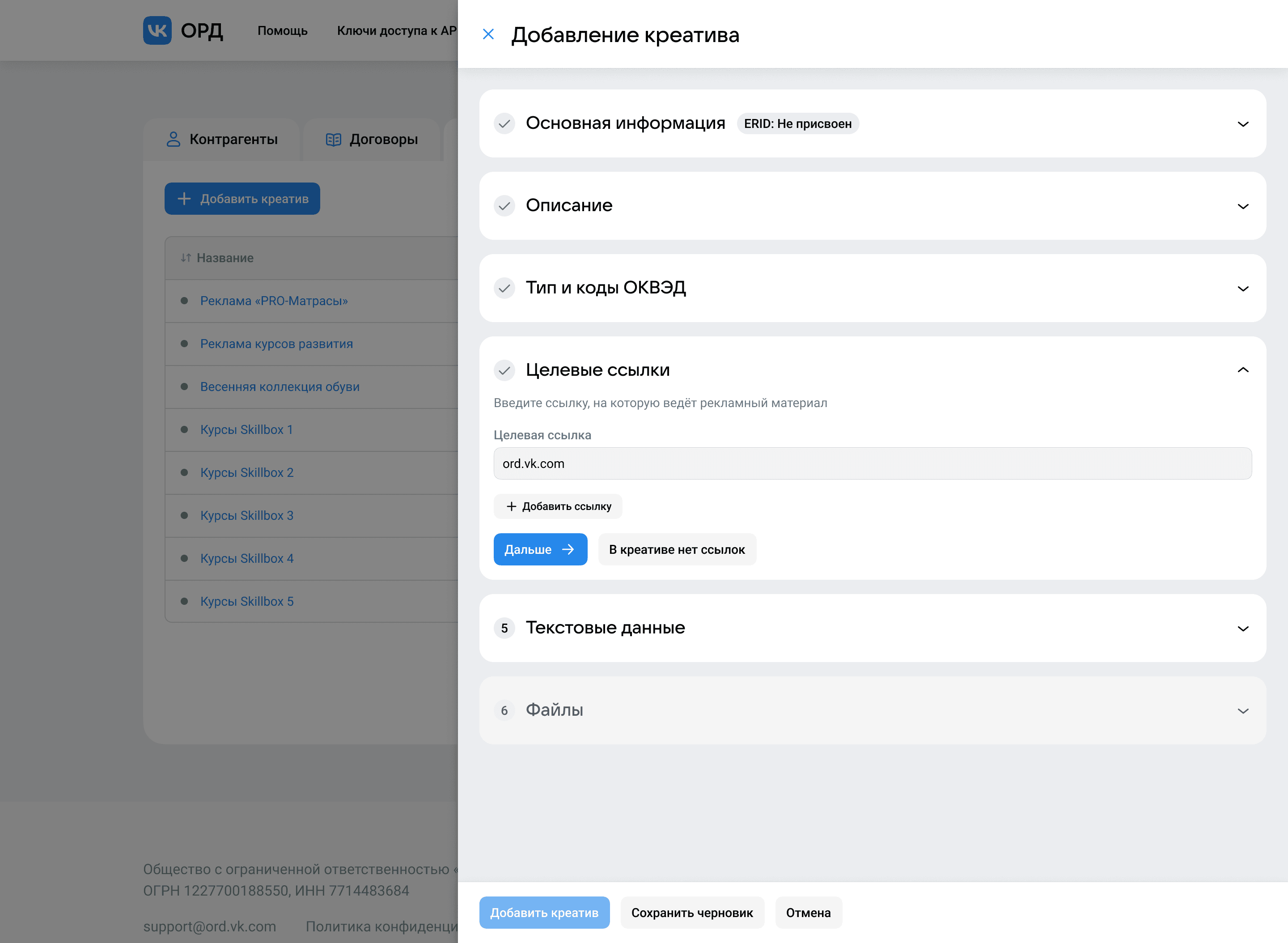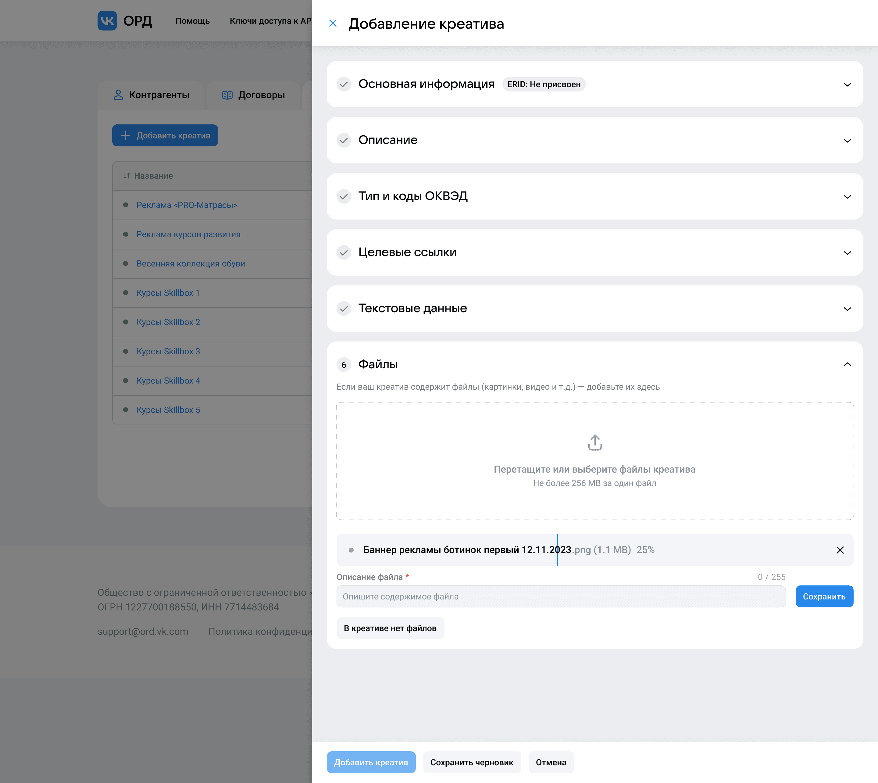 Идентификатор рекламного креатива, он же ERID, является ключевым для поиска нужных креативов, поэтому было принято решение дать ему больше акцента и сразу показать, где его можно будет увидеть. Пока креатив только регистрируется, в форме указывается, что ERID ещё не присвоен — он отобразится там как только ЕРИР одобрит данные