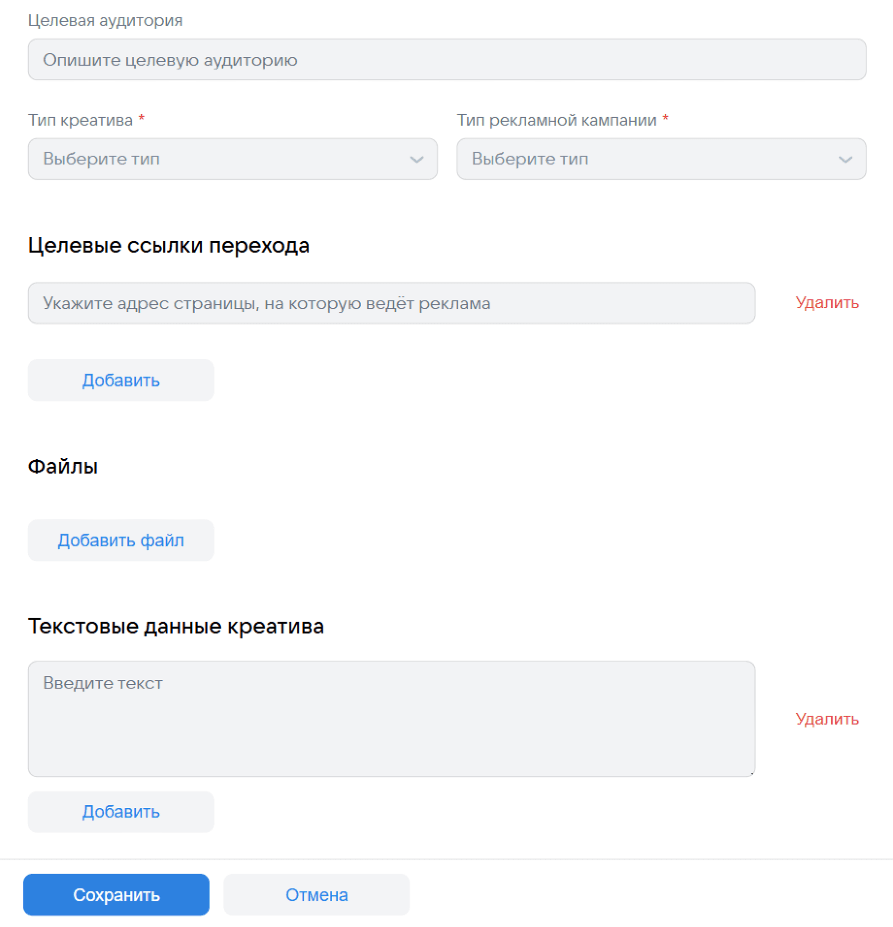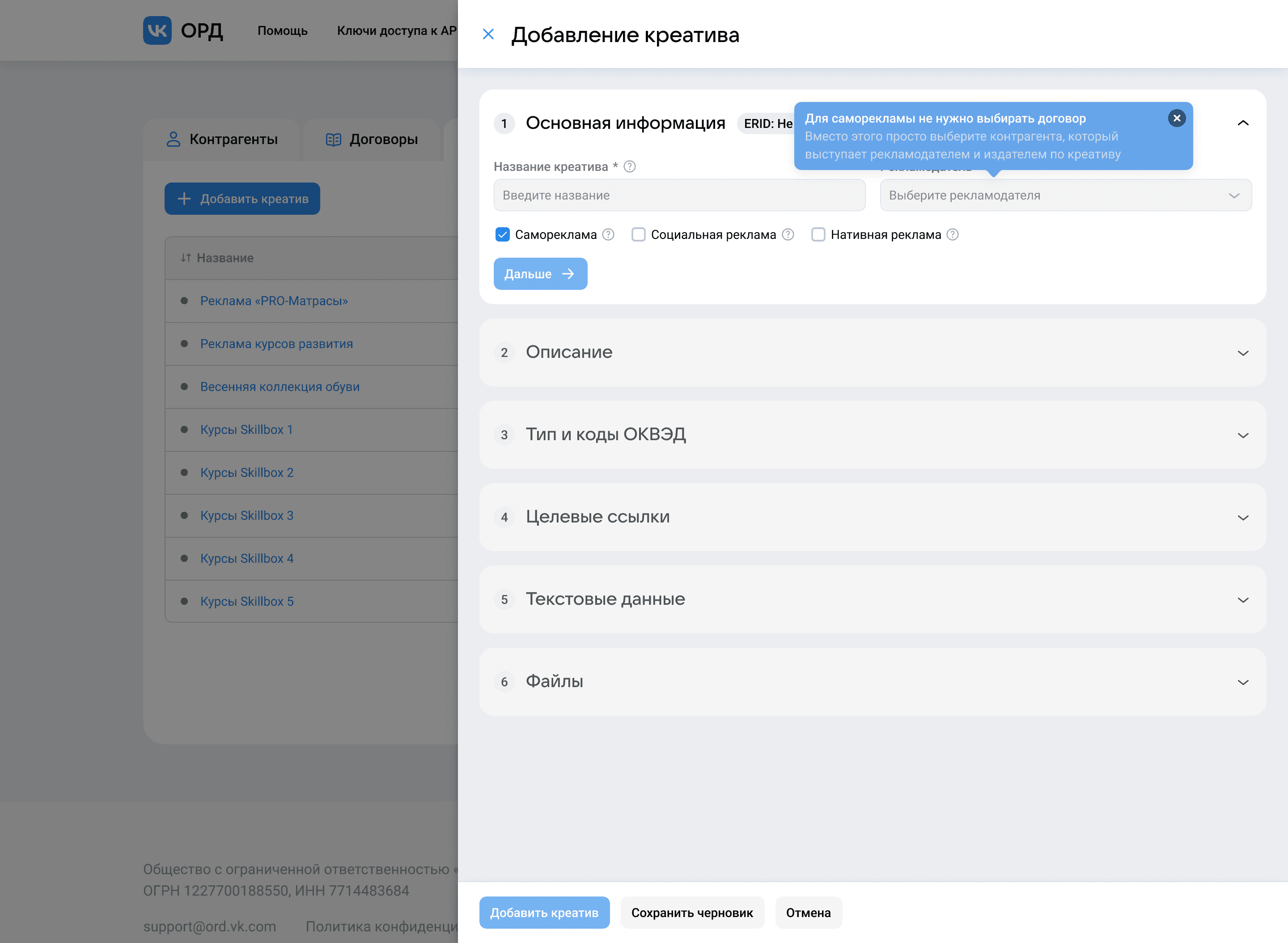 Форма подстраивается под контекст и учитывает корнеркейсы. Например, если рекламный креатив является саморекламой, то форма даёт подсказки по её заполнению. Или если креатив никуда не ведёт, то можно нажать специальную кнопку, отметив, что ссылок в креативе нет. Таким образом пользователь не будет переживать о том, что ему надо что-то указать, чего у него нет.