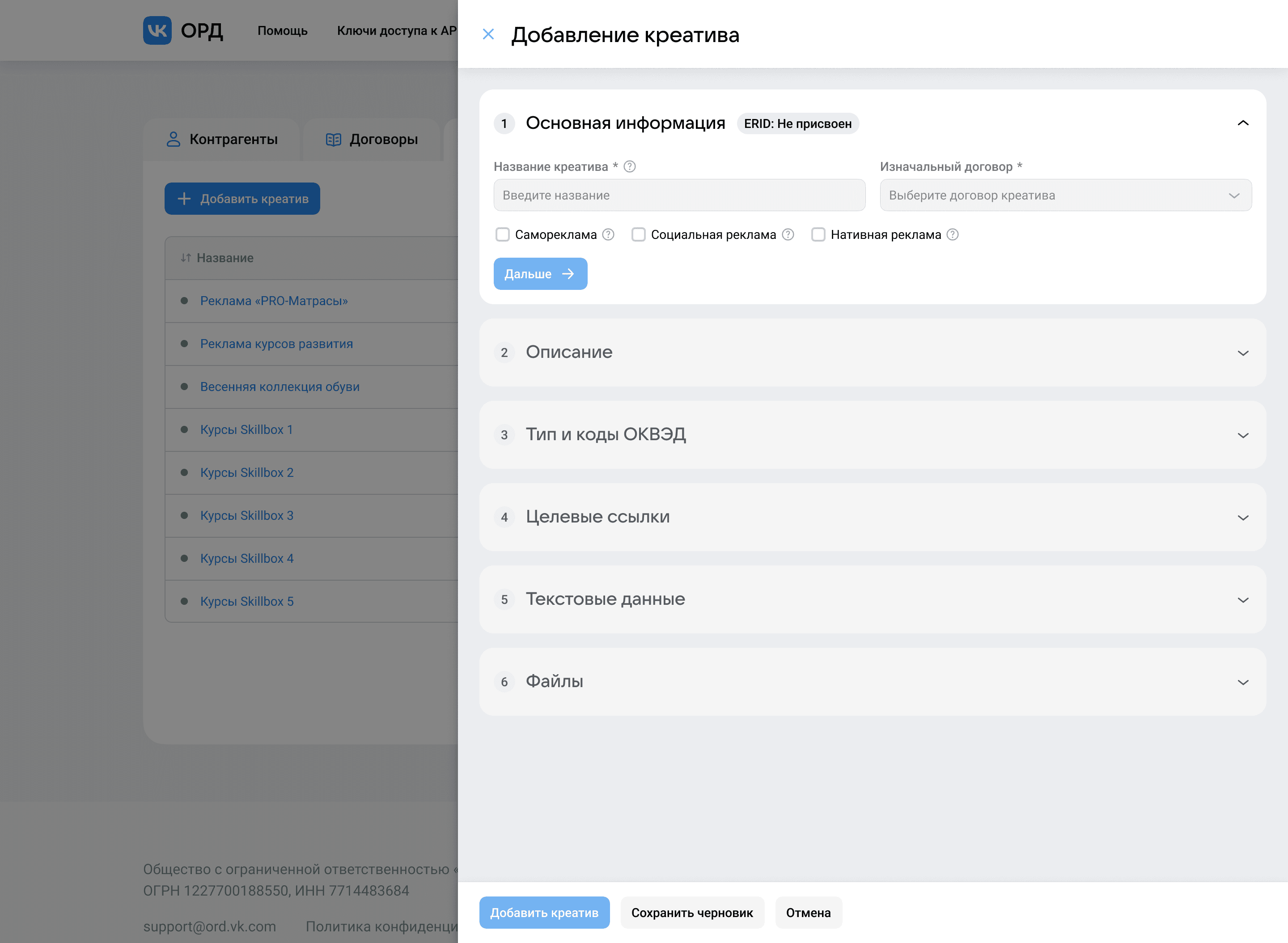 Первый шаг формы регистрации креатива после обновления