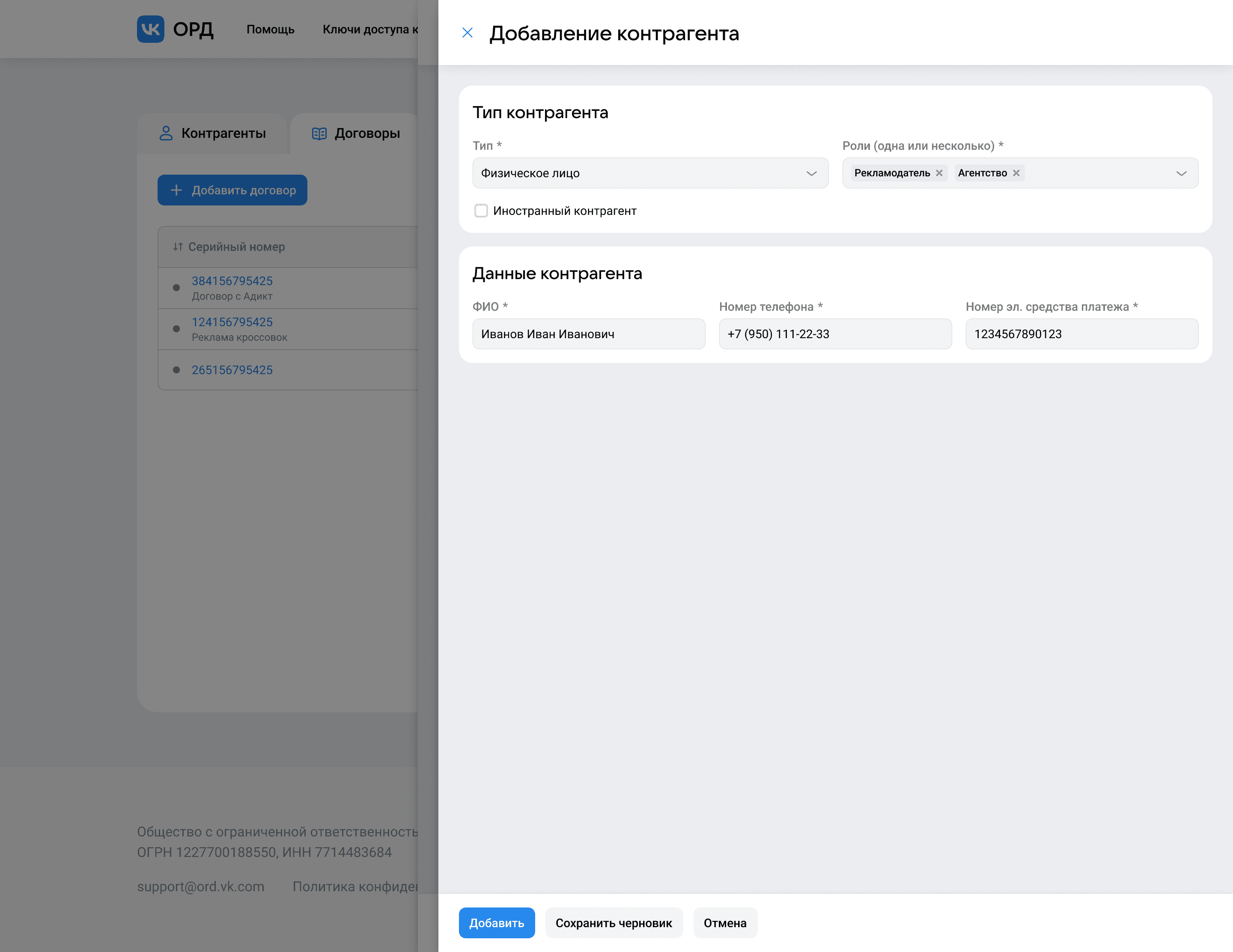 Обновлённая форма контрагента, открытая поверх формы добавления договора