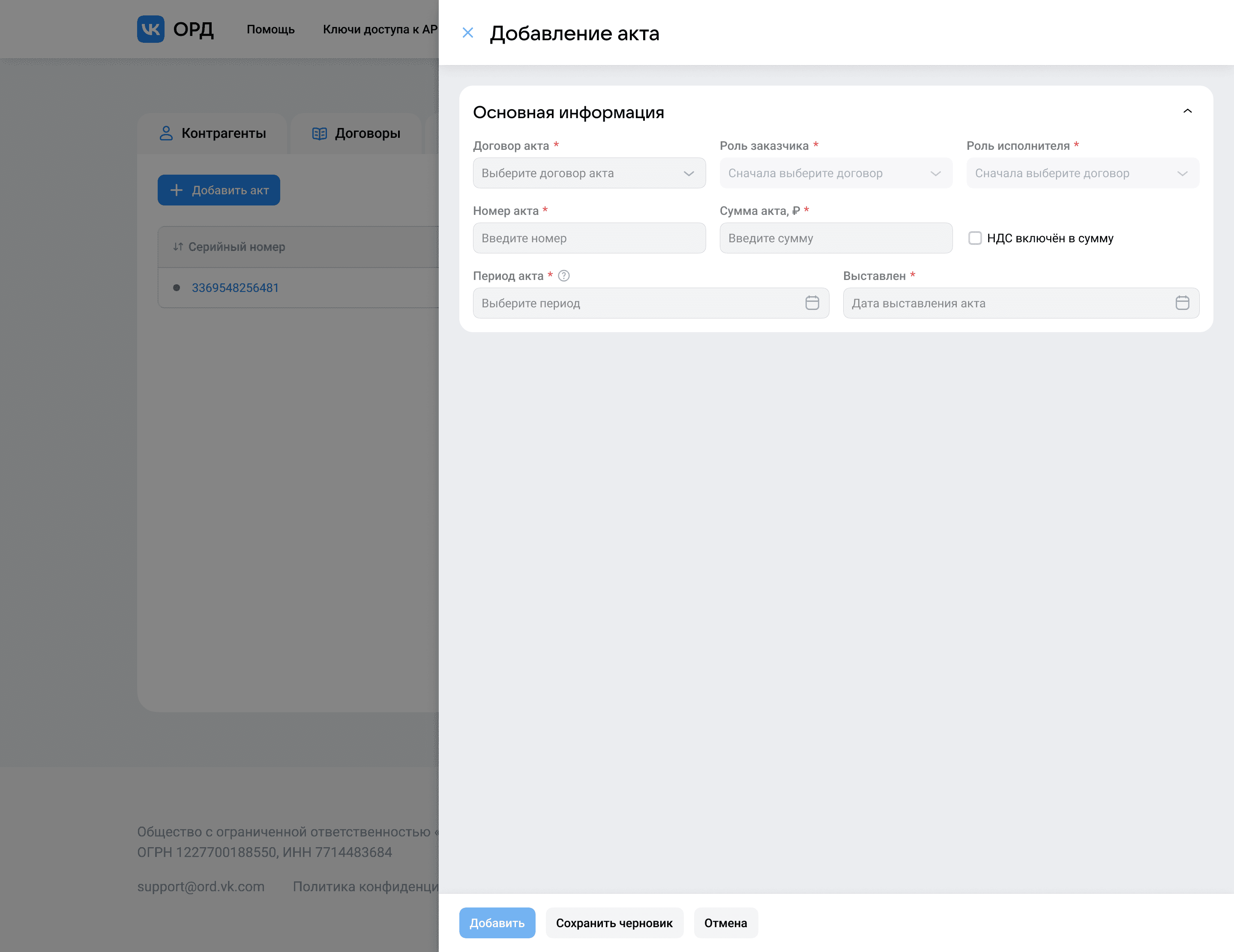 Бывают кейсы, когда в рамках акта нужно указать исполнителя издателем, но чаще всего такую роль контрагенту даже не заводят. Особенность этой роли в том, что для её добавления контрагенту нужно указать площадку, издателем которой является контрагент. Форма предусматривает этот кейс и выводит подсказку о добавлении площадки, а мультимодальность позволит решить этот кейс не покидая форму акта.